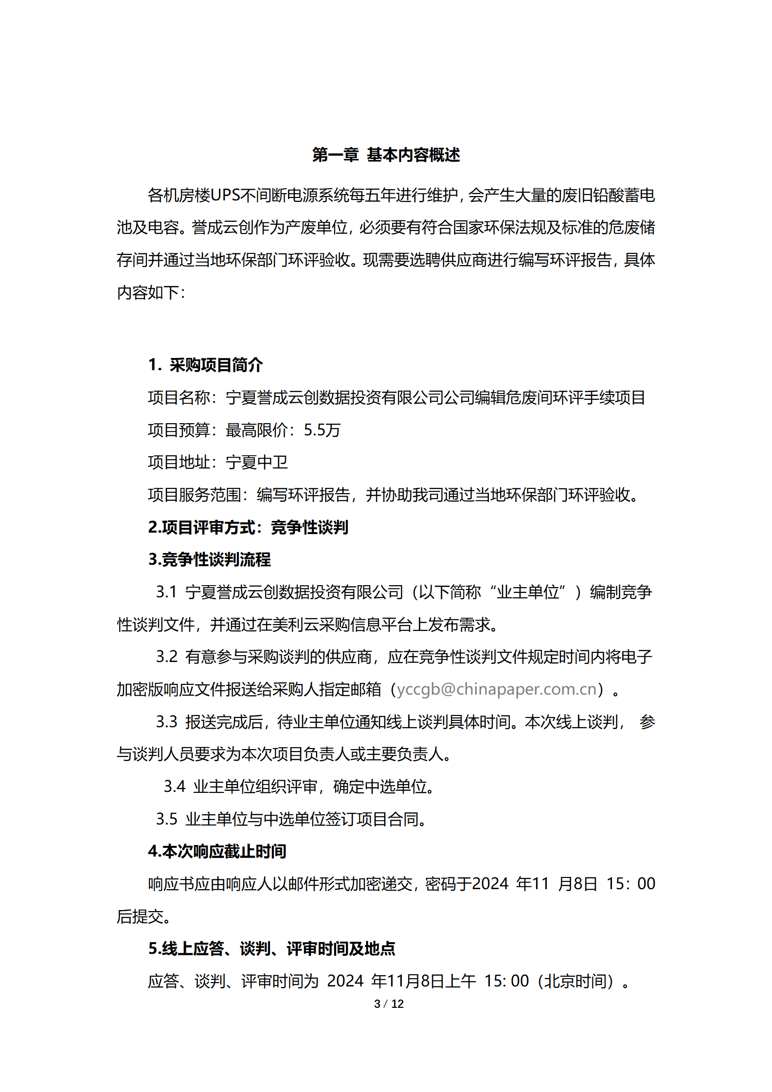 寧夏譽成云創(chuàng)數(shù)據(jù)投資有限公司現(xiàn)采購公司危廢間環(huán)評手續(xù)編輯項目,詳細采購信息參見附件詢價文件。
