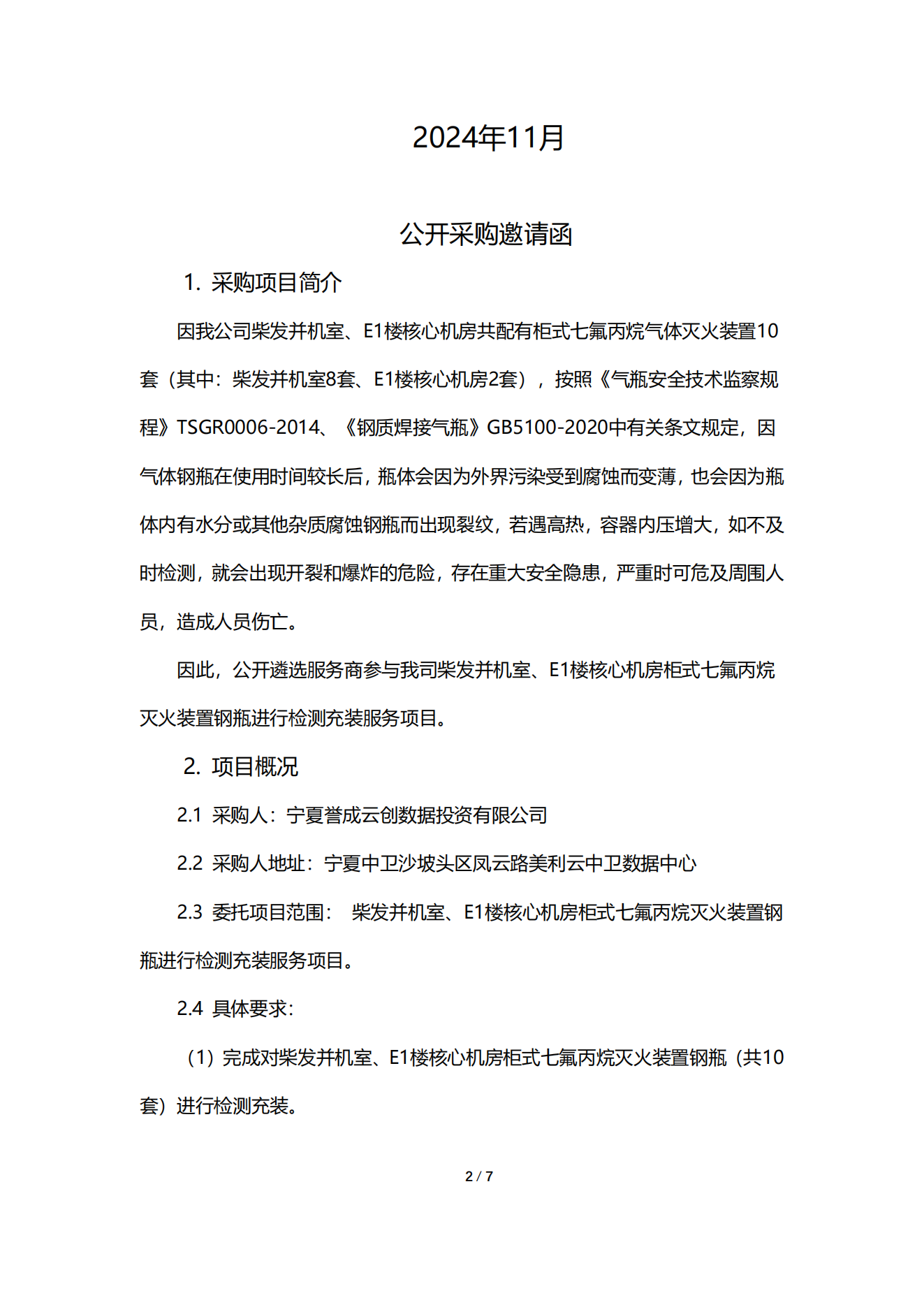 寧夏譽(yù)成云創(chuàng)數(shù)據(jù)投資有限公司(簡稱“譽(yù)成云創(chuàng)”),美利云中衛(wèi)數(shù)據(jù)中心柴發(fā)并機(jī)室、E1樓核心機(jī)房共配有柜式七氟丙烷氣體滅火裝置10套(其中:柴發(fā)并機(jī)室8套、E1樓核心機(jī)房2套),按照《氣瓶安全技術(shù)監(jiān)察規(guī)程》TSGR0006-2014、《鋼質(zhì)焊接氣瓶》GB5100-2020中有關(guān)條文規(guī)定,因氣體鋼瓶在使用時(shí)間較長后,瓶體會因?yàn)橥饨缥廴臼艿礁g而變薄,也會因?yàn)槠矿w內(nèi)有水分或其他雜質(zhì)腐蝕鋼瓶而出現(xiàn)裂紋,若遇高熱,容器內(nèi)壓增大,如不及時(shí)檢測,就會出現(xiàn)開裂和爆炸的危險(xiǎn),存在重大安全隱患,嚴(yán)重時(shí)可危及周圍人員,造成人員傷亡。 因此,公開遴選服務(wù)商參與我司柴發(fā)并機(jī)室、E1樓核心機(jī)房柜式七氟丙烷滅火裝置鋼瓶進(jìn)行檢測充裝服務(wù)項(xiàng)目。??采購信息詳見附件【關(guān)于《寧夏譽(yù)成云創(chuàng)數(shù)據(jù)投資有限公司柴發(fā)并機(jī)室、E1樓核心機(jī)房柜式七氟丙烷滅火裝置鋼瓶進(jìn)行檢測充裝服務(wù)項(xiàng)目》采購文件】。